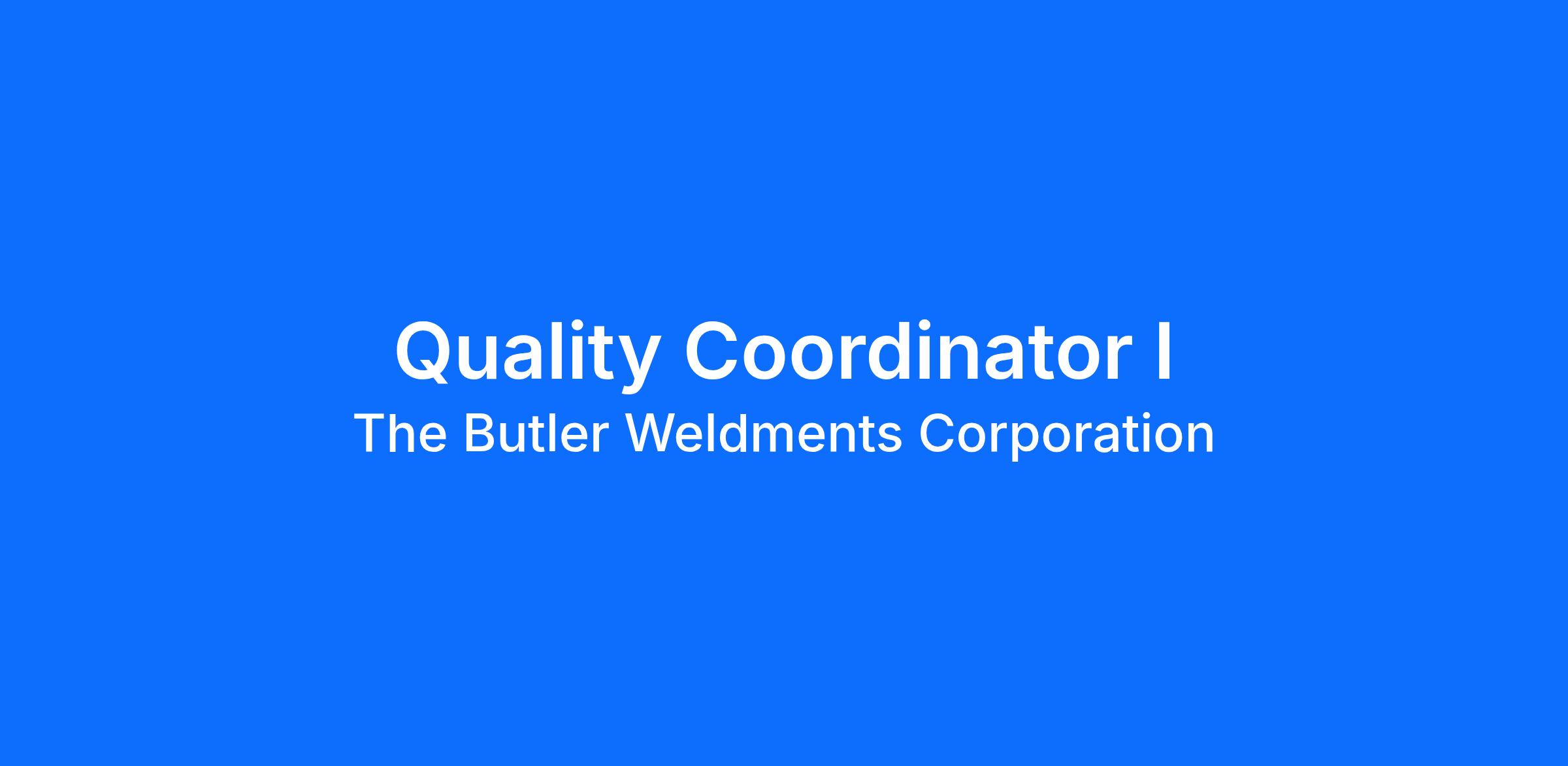 The Quality Coordinator I collects and organizes information in order to create checklists, work instructions, procedures and standards to support Butler Weldments quality systems and shop practices. This position is also responsible for supporting other departmental activities as detailed below.