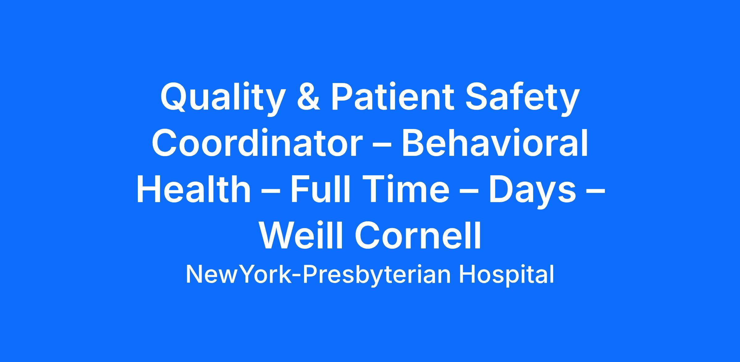 Quality & Patient Safety Coordinator – Behavioral Health – Full Time – Days – Weill Cornell